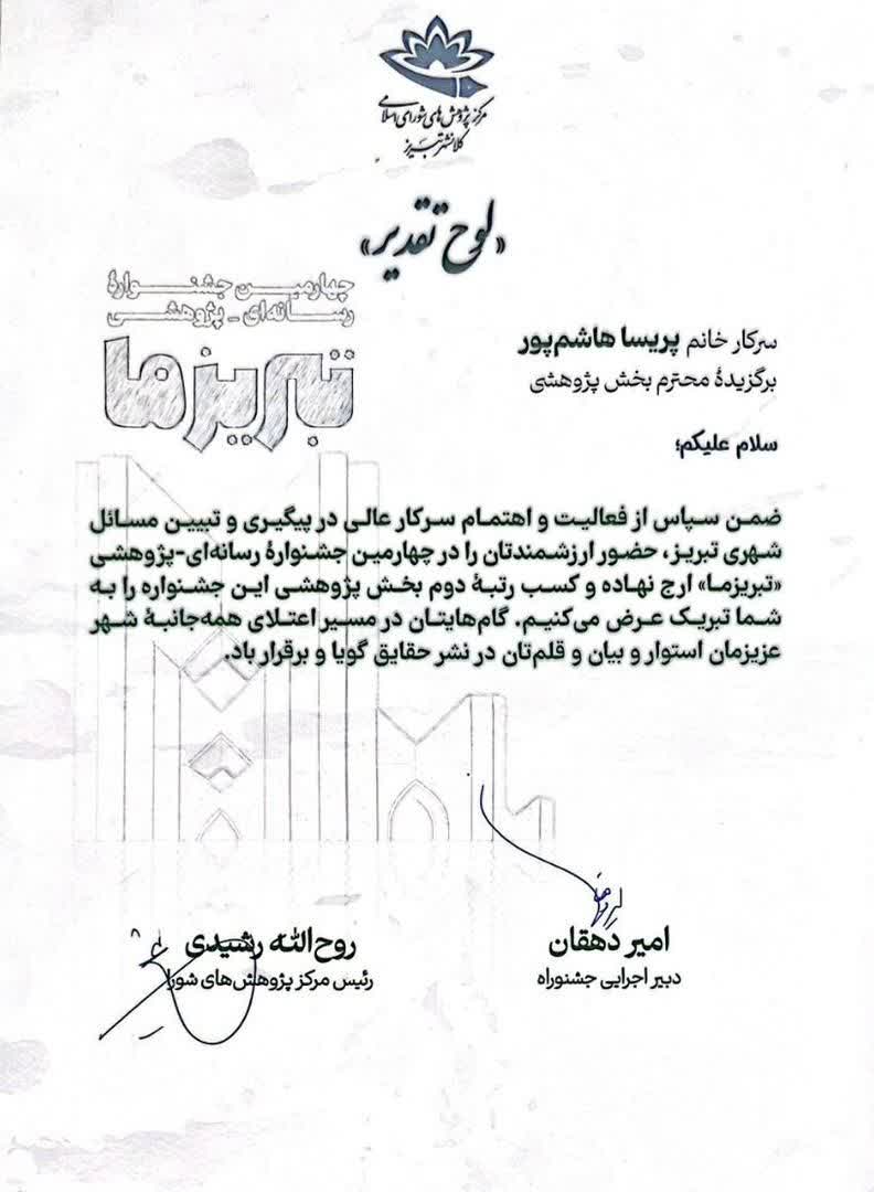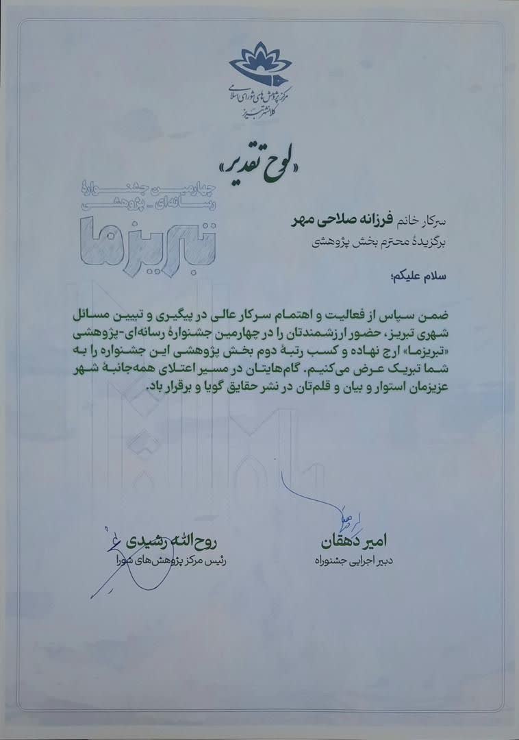 امید است حضور مؤثر و پژوهشهای ارزشمند ایشان در مسیر پیشبرد اهداف علمی و فرهنگی شهر تبریز همچنان ادامه داشته باشد.