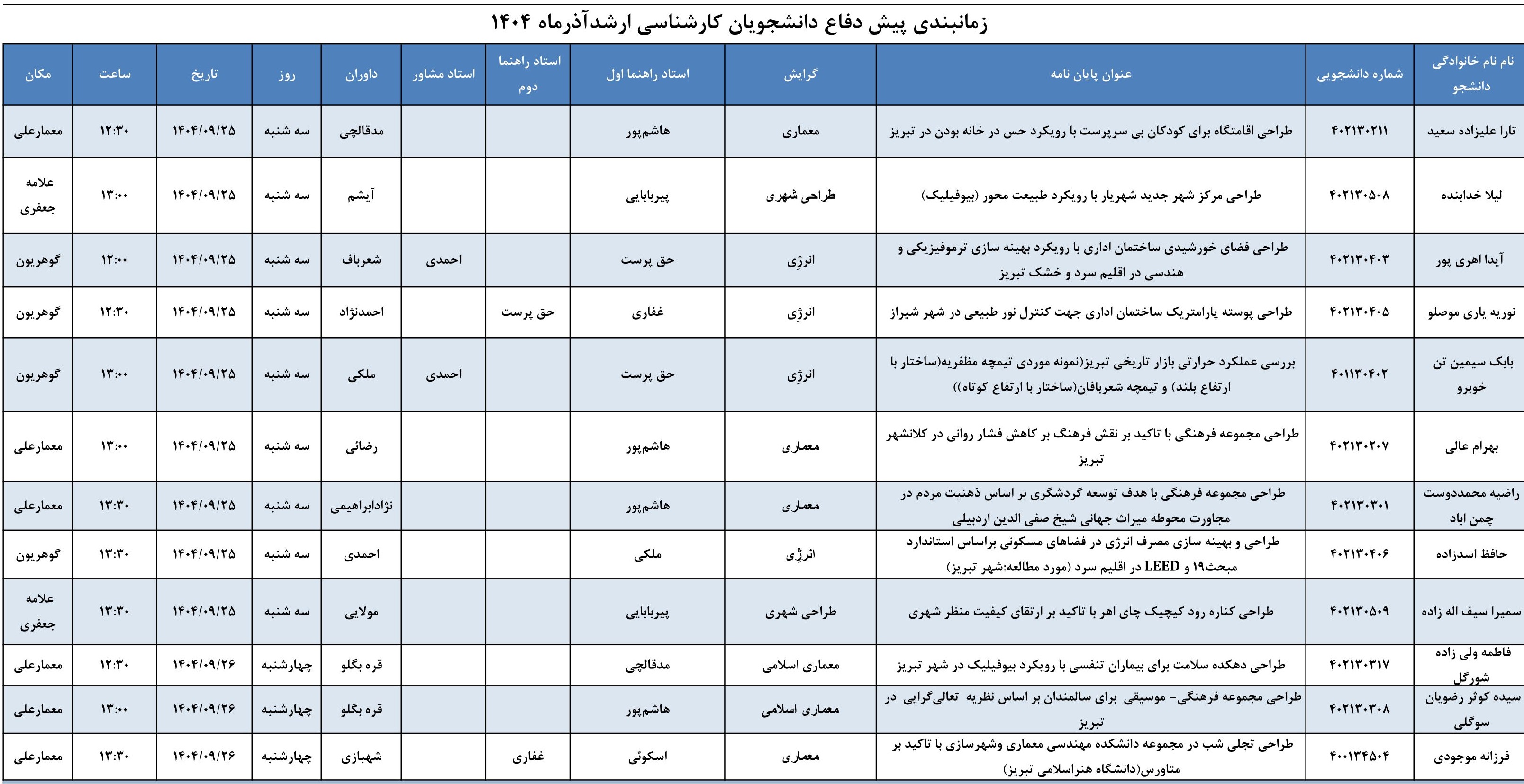 فایل پایان نامه خود به صورت word را (مطالب مربوط به پیش دفاع در فرمت doc یا docx) می بایست تا تاریخ 22 آذرماه به ایمیل دانشکده Archurb.pg@tabriziau.ac.ir ارسال نمایند . بدیهی است؛ در صورت عدم ارسال در موعد مقرر ، امکان برگزاری جلسه برای دانشجویان نخواهد بود .